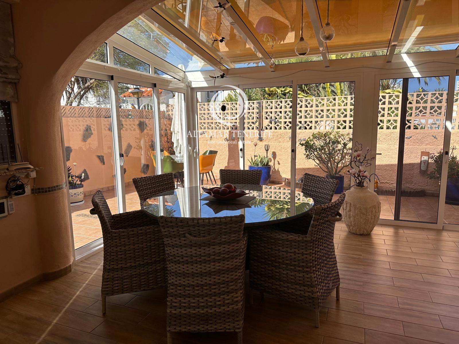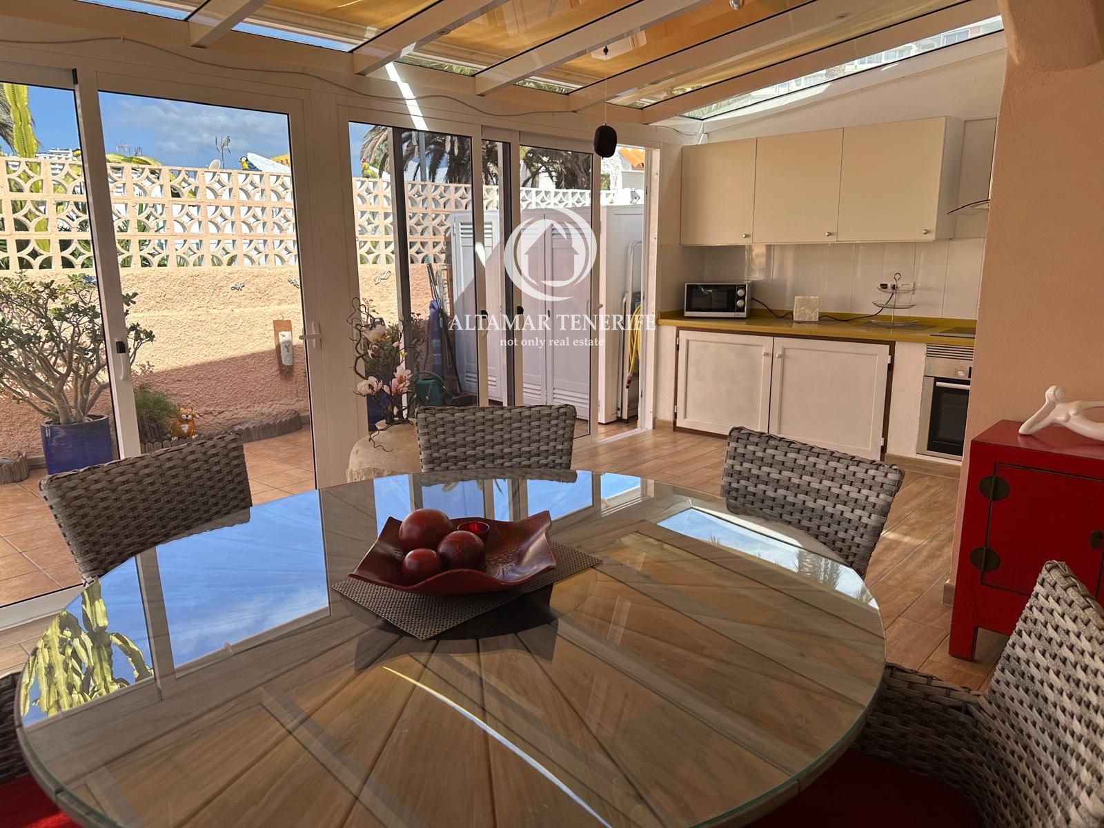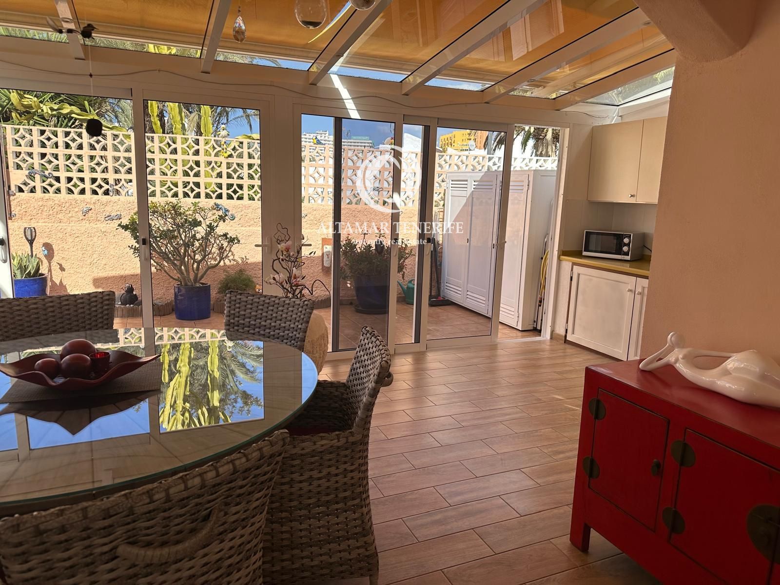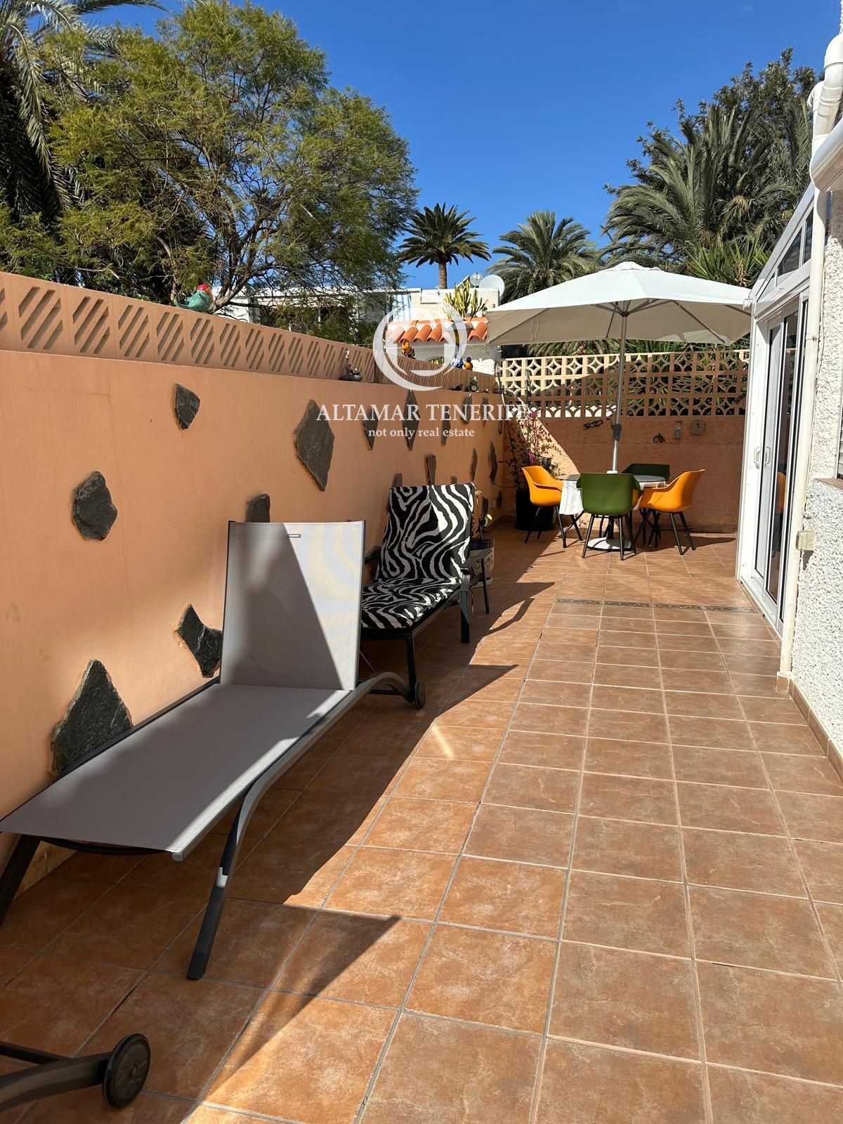 Im Außenbereich erwartet Sie eine private Terrasse mit ausreichend Platz für Sonnenliegen und einen Esstisch, ideal, um das privilegierte Klima im Süden Teneriffas zu genießen.