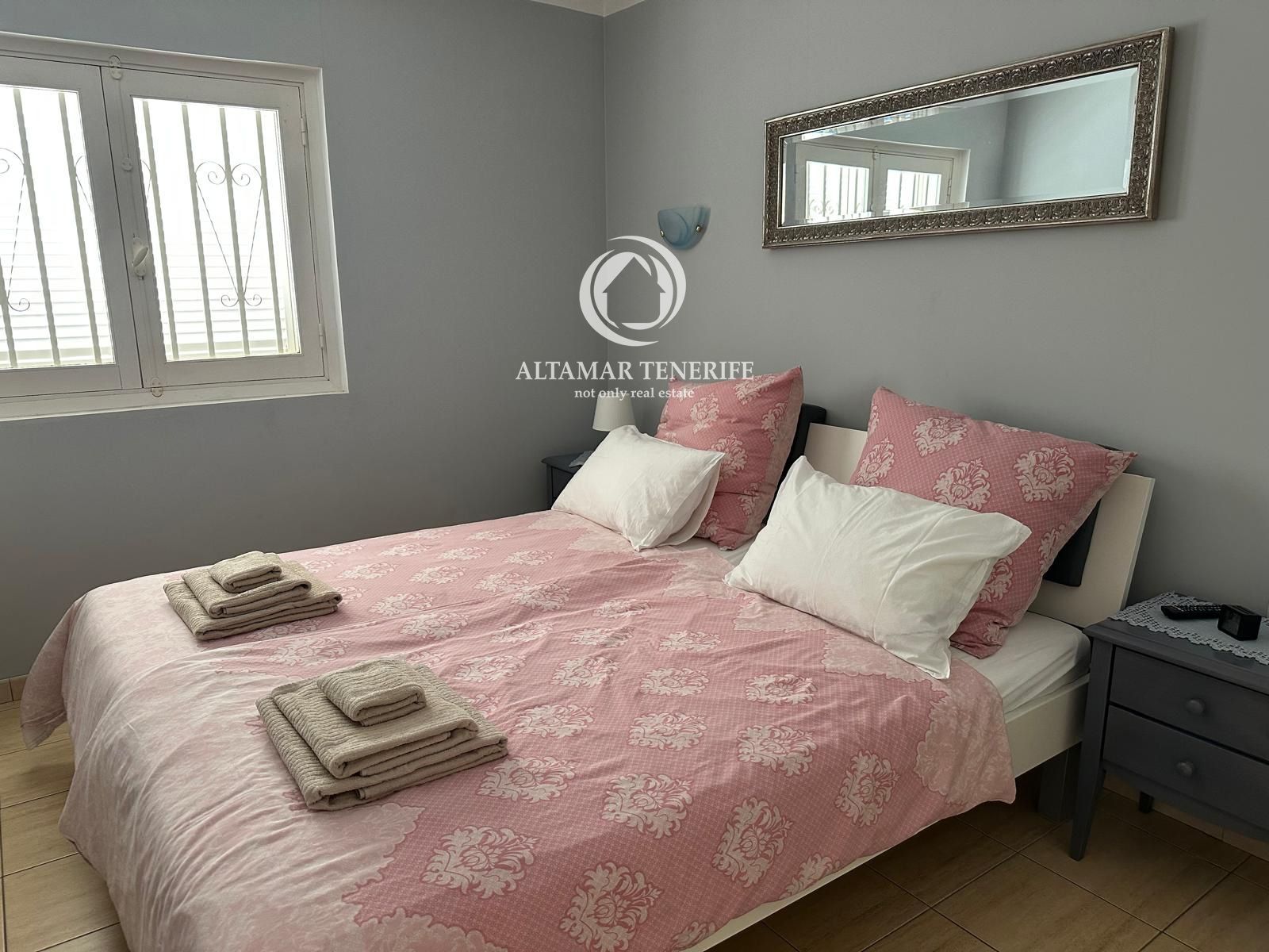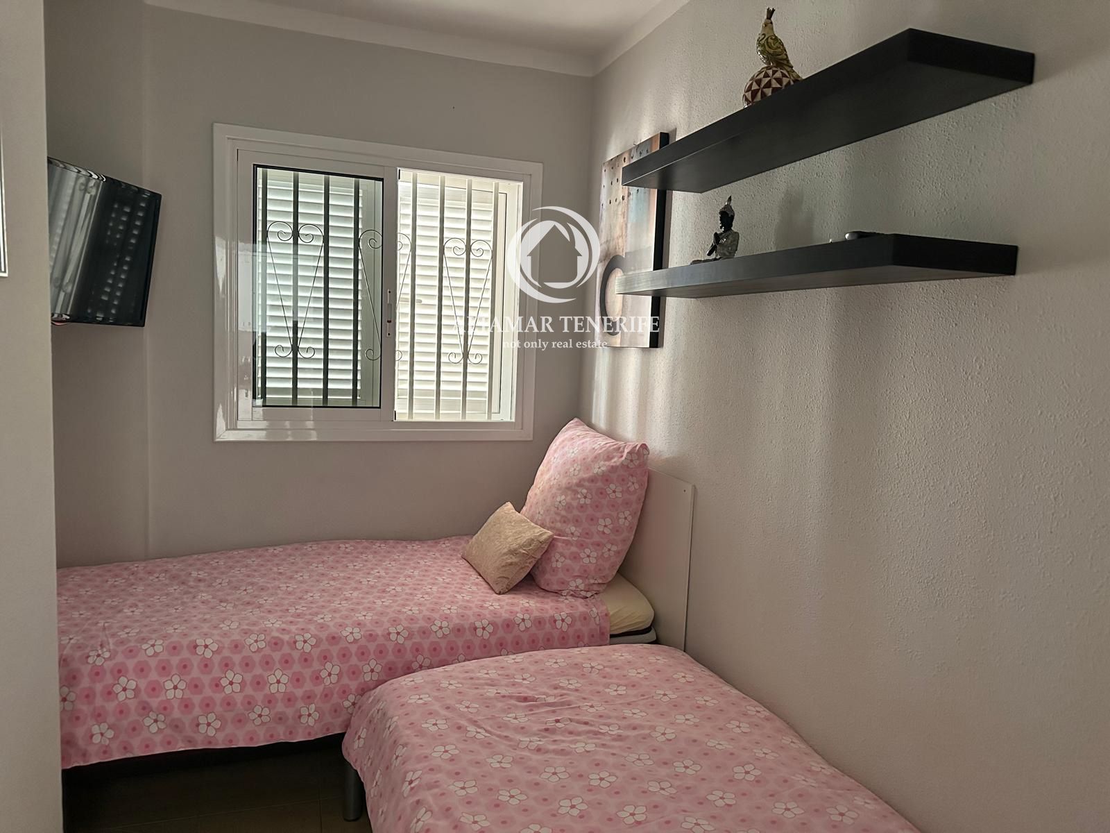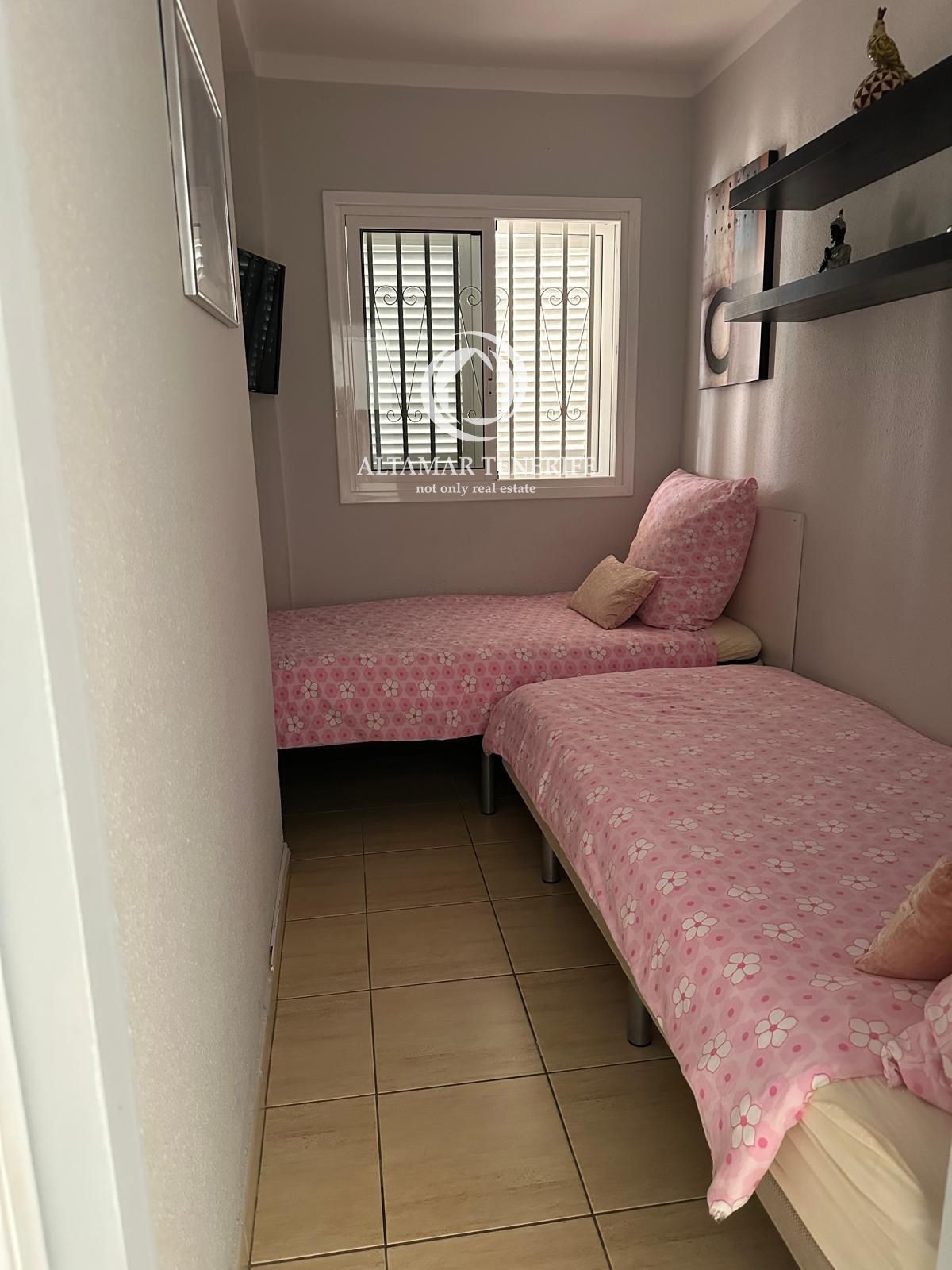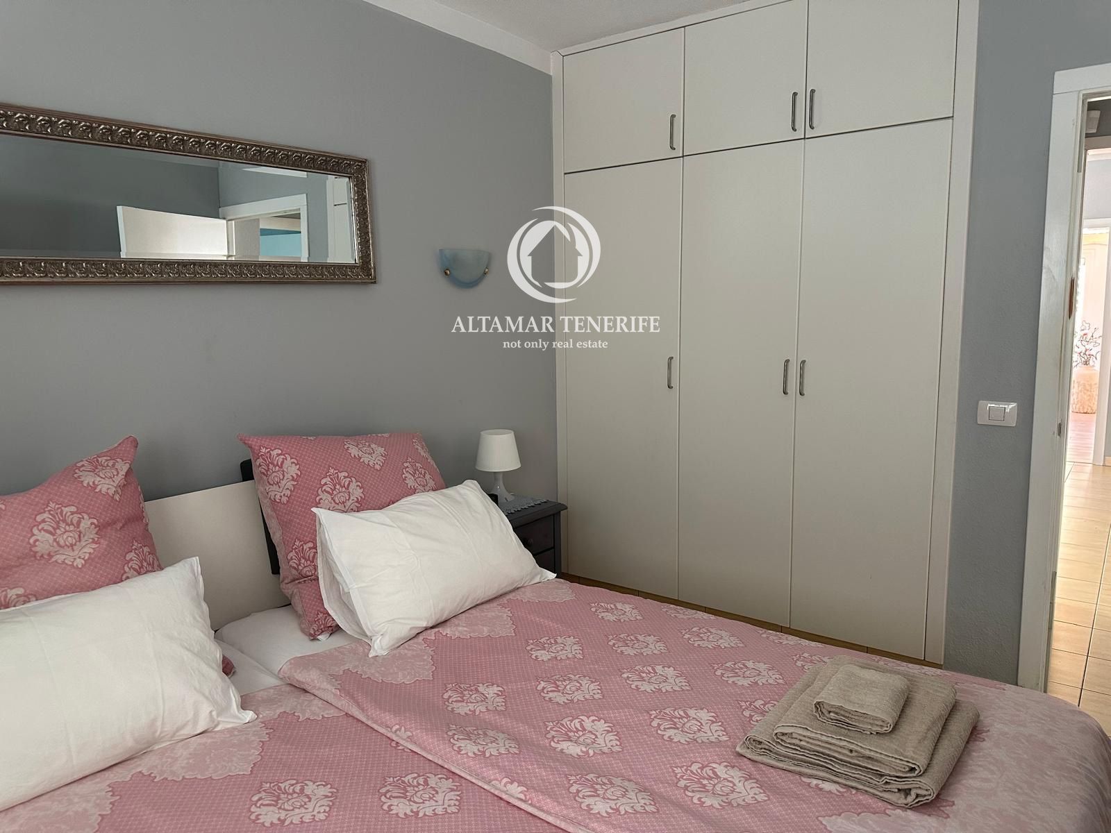 Die Wohnung wurde kürzlich renoviert und bietet ein modernes, elegantes und komfortables Wohnambiente. Sie verfügt über zwei Schlafzimmer: das Hauptschlafzimmer mit Doppelbett und Einbauschränken sowie ein zweites Schlafzimmer mit zwei Einzelbetten – ideal für Familie oder Gäste. Ein stilvolles Badezimmer ergänzt den Ruhebereich.