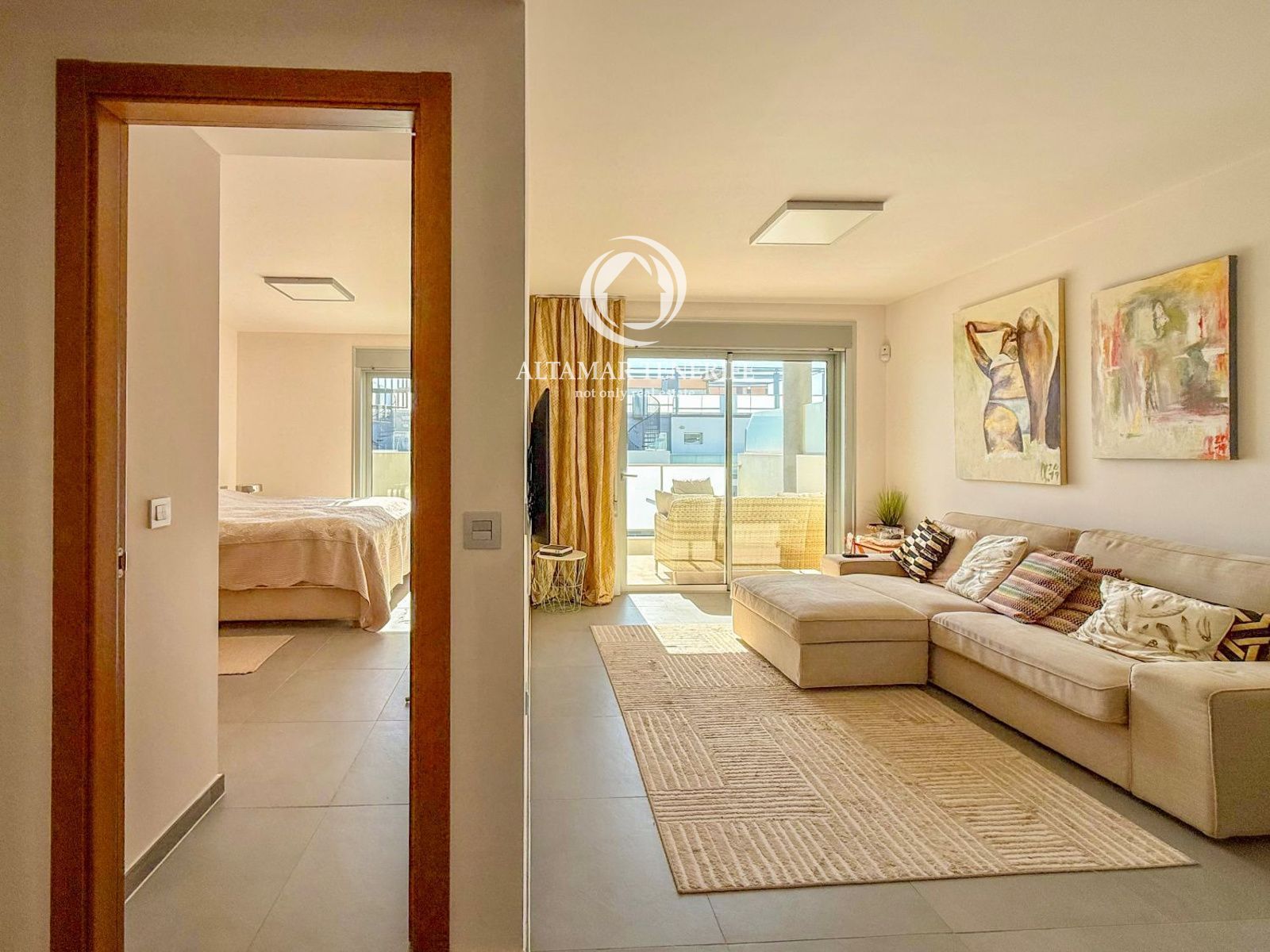 Das Penthouse verfügt über 1 Schlafzimmer mit Einbauschrank und 1 Badezimmer mit Dusche sowie eine voll ausgestattete offene Küche. Das helle Wohnzimmer öffnet sich zur Terrasse, die eine Spindeltreppe zur Dachterrasse hat – ideal, um Sonne und Ausblick zu genießen. Die Wohnung wird voll möbliert verkauft un beinhaltet Abstellraum und Parkplatz.