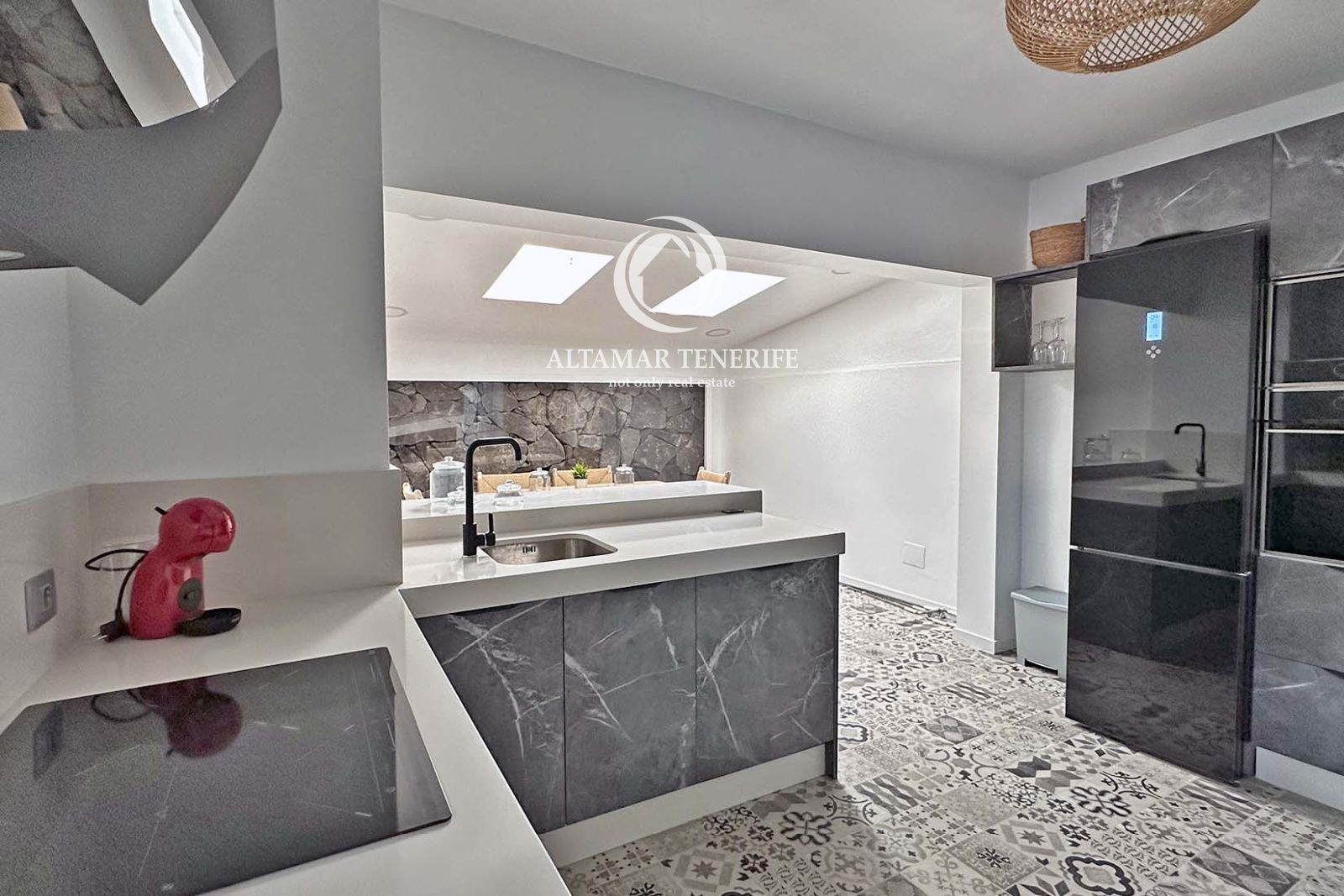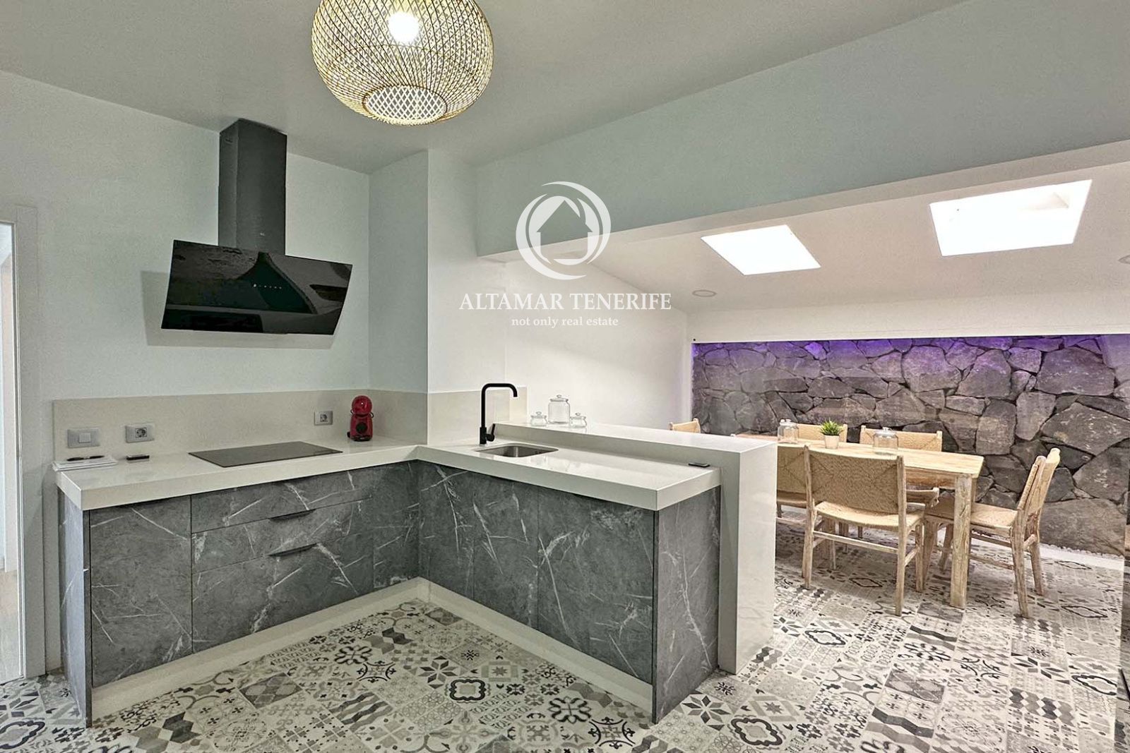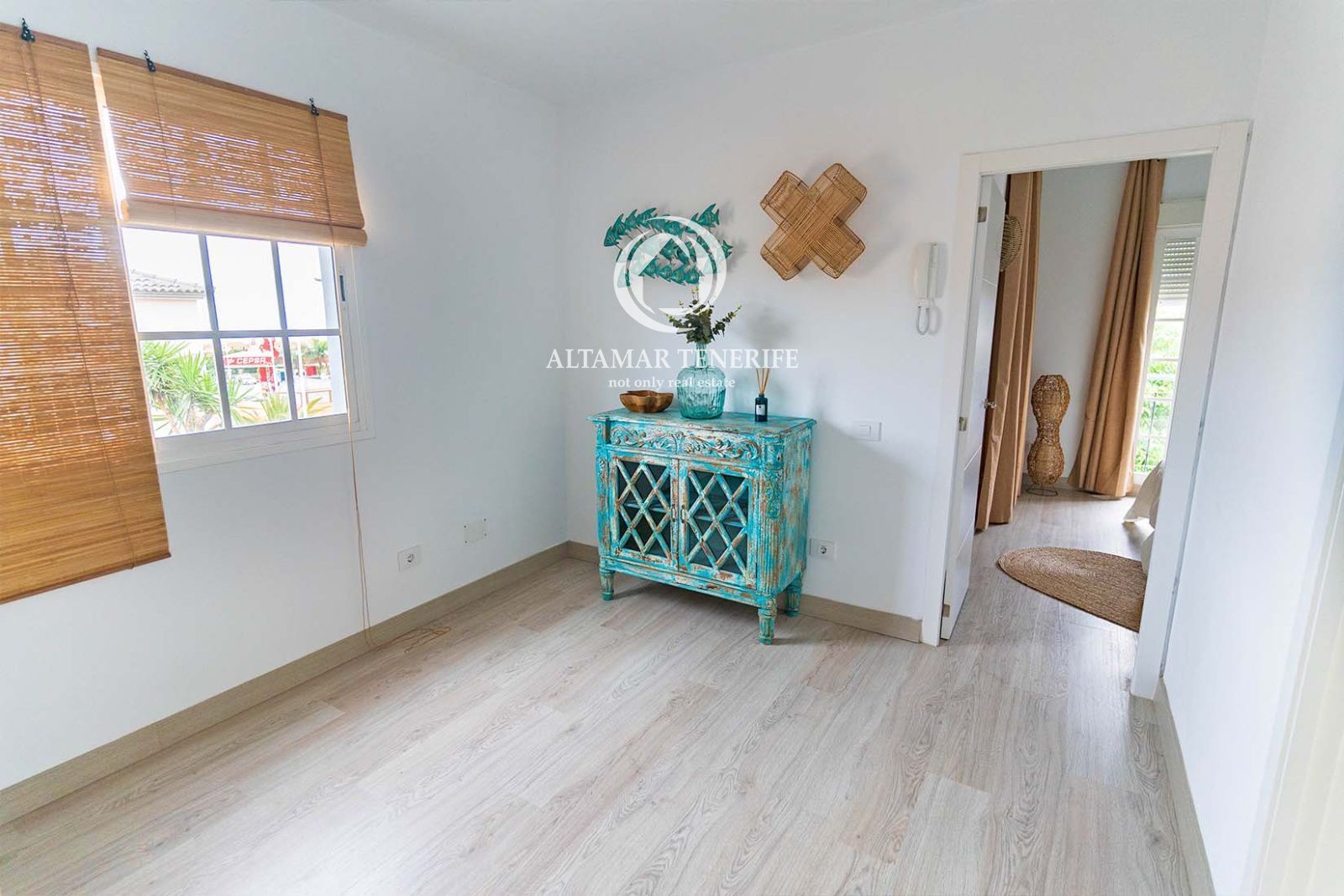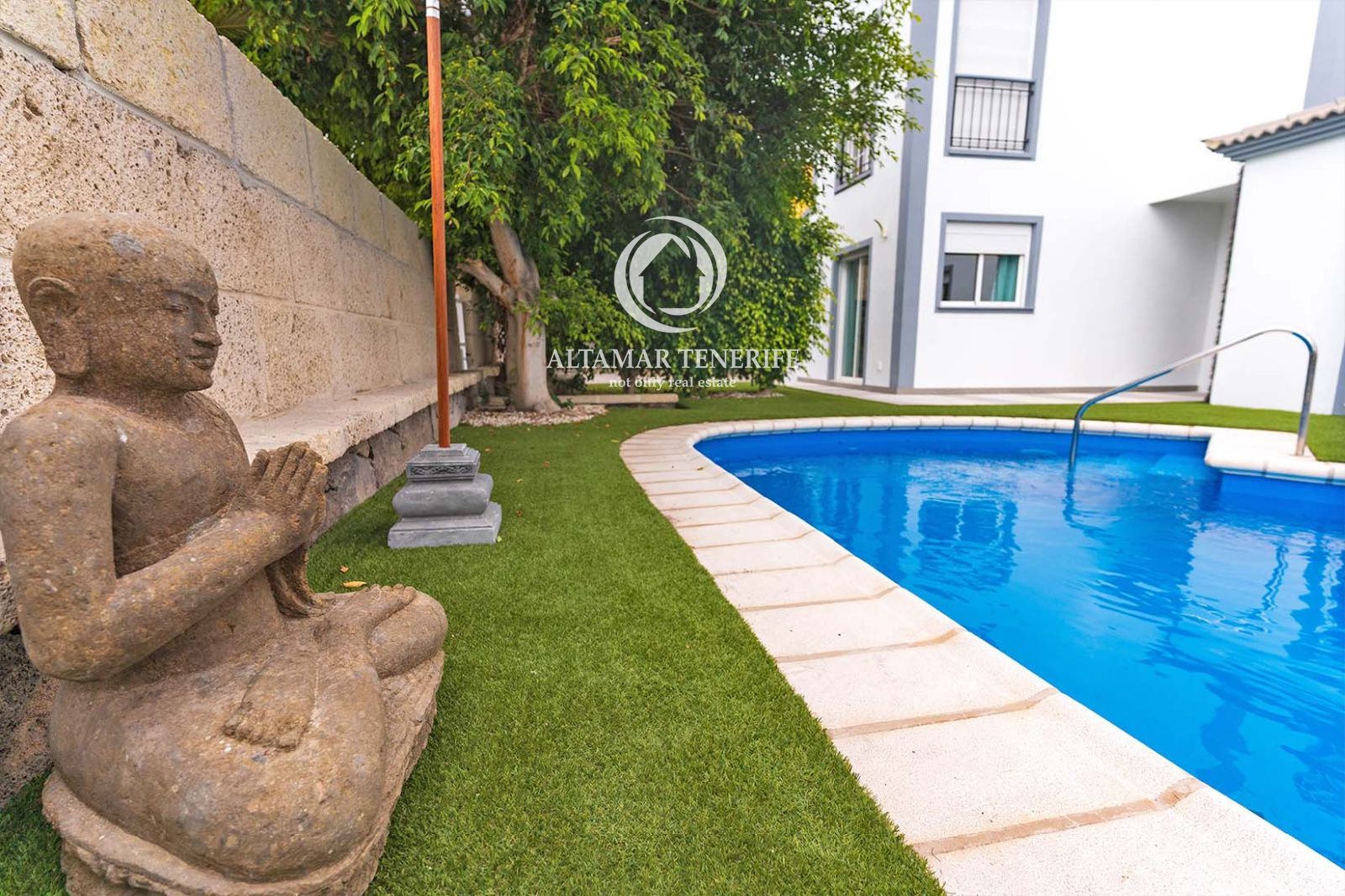 Diese elegante, 2000 erbaute und kürzlich renovierte Doppelhaushälfte liegt in der exklusiven Wohnanlage Valle de Fañabé. Auf einem 320 m² großen Grundstück verteilt sich das Haus über zwei Etagen mit hellem Wohnbereich und direktem Zugang zum Garten mit privatem Pool, separater Küche mit Essbereich, Gäste-WC und einem großzügigen Schlafzimmer mit Bad en suite im Erdgeschoss. Im Obergeschoss befinden sich zwei weitere Schlafzimmer, ein Badezimmer und ein spektakulärer Meerblick.