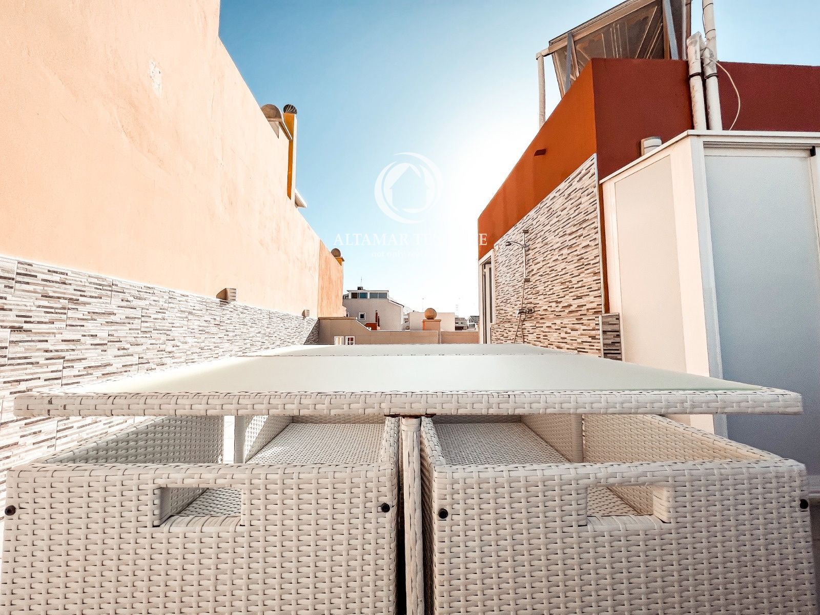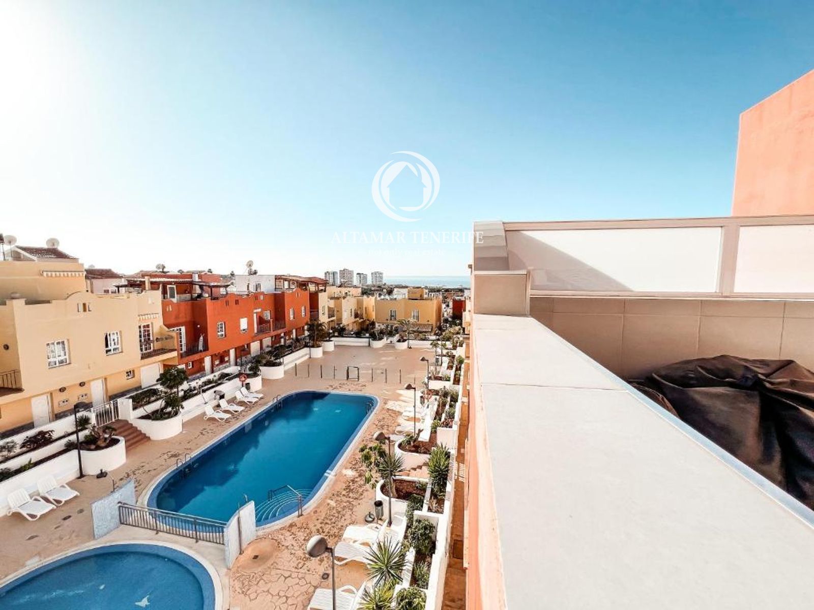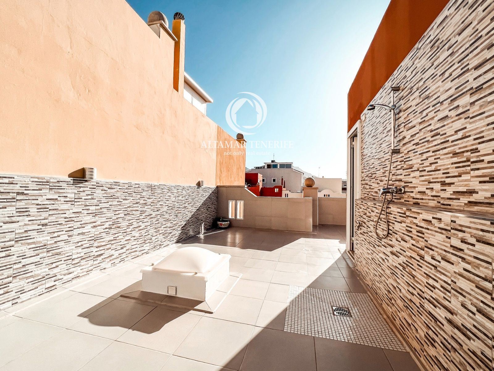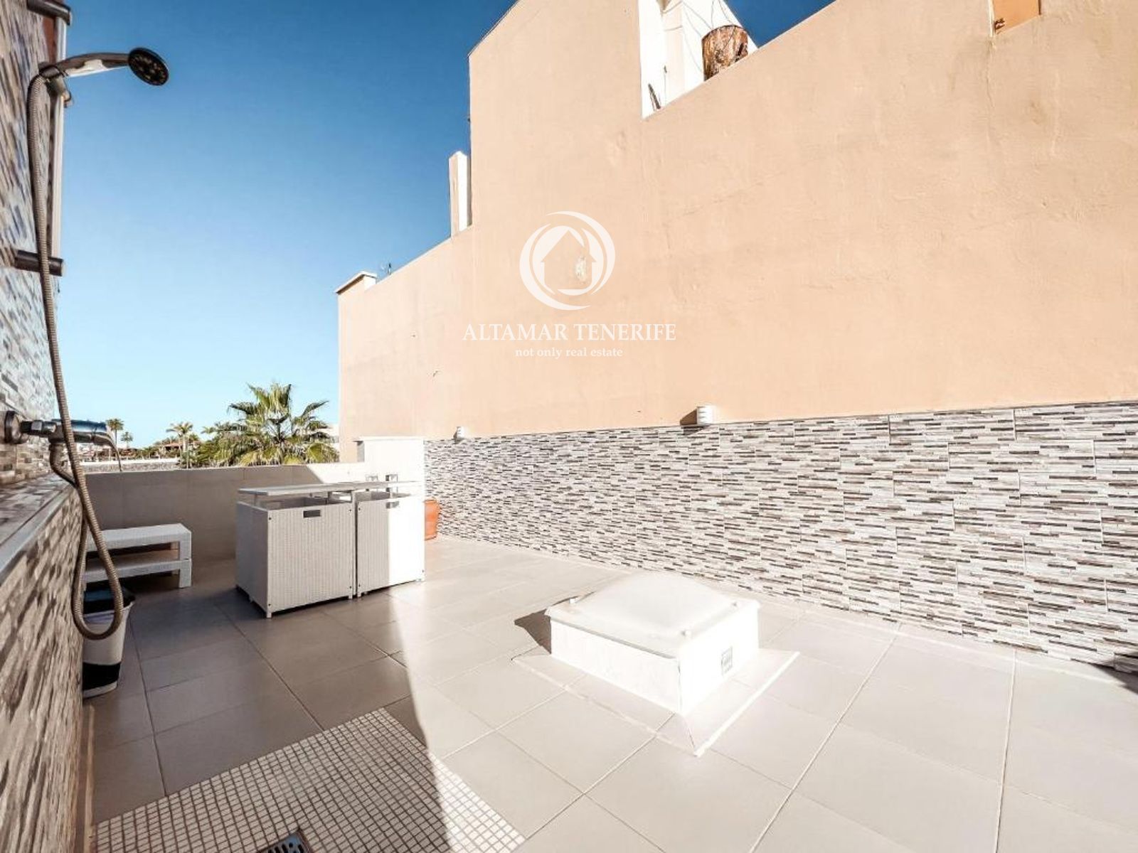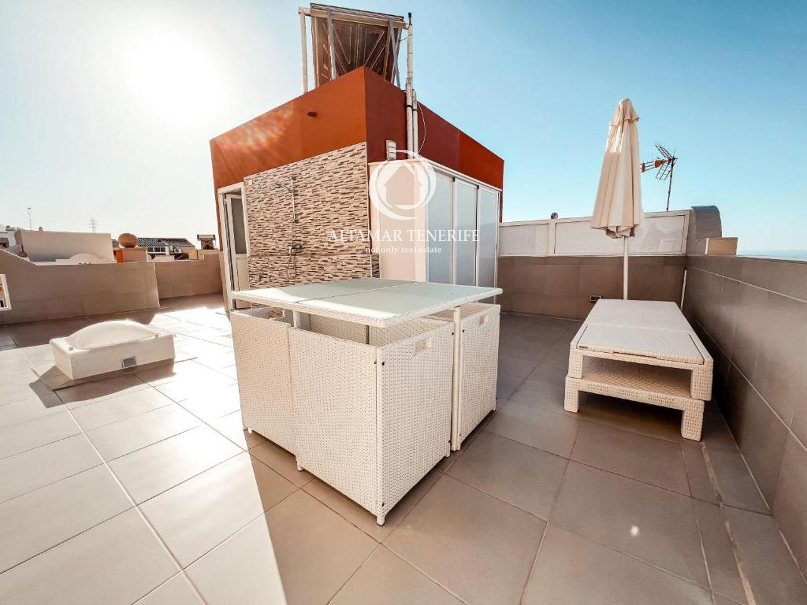 On the top floor, the property offers a large, fully renovated rooftop terrace equipped with a shower and relaxation area. This private space provides excellent views of the sea and the complex surroundings.