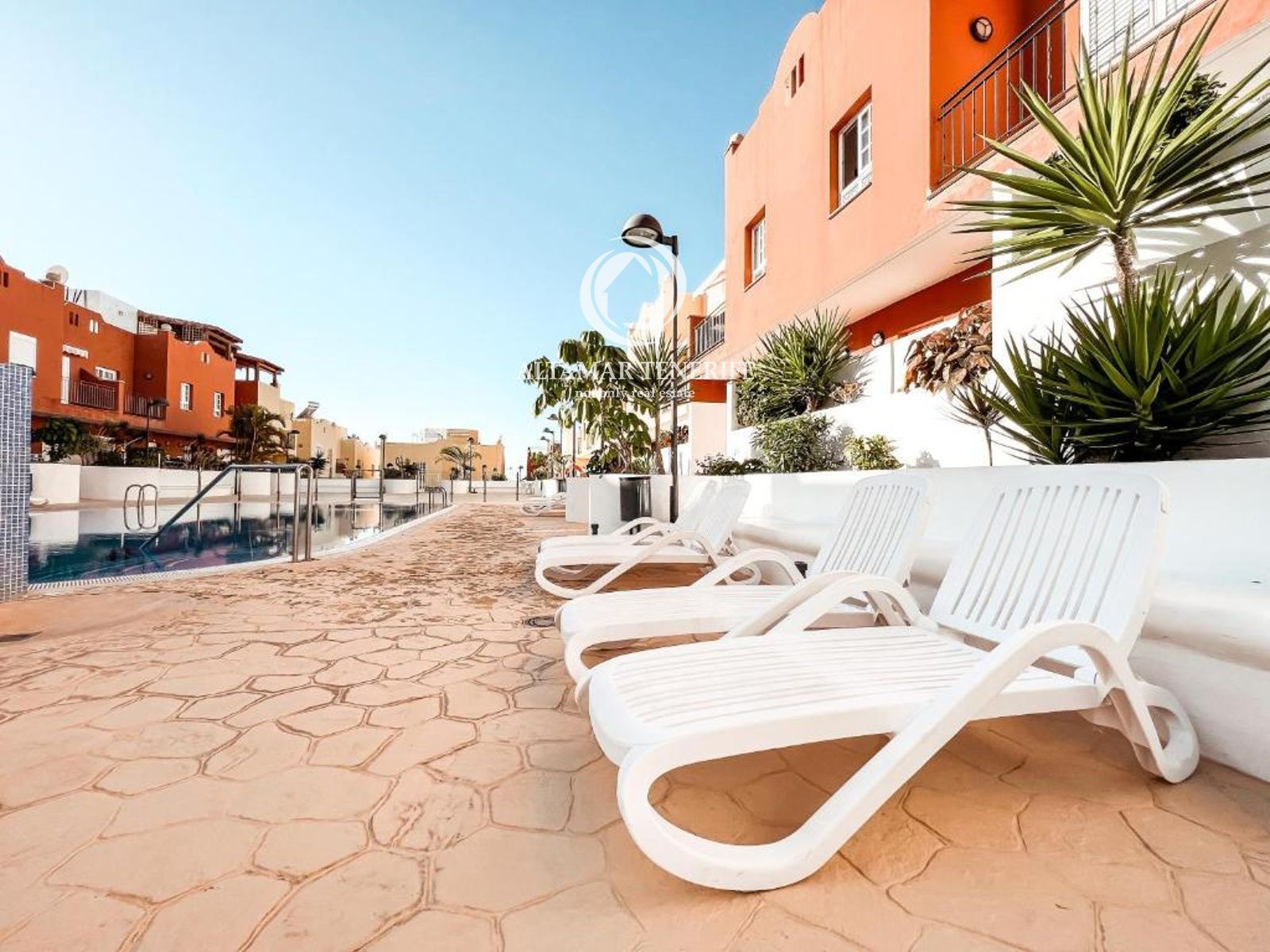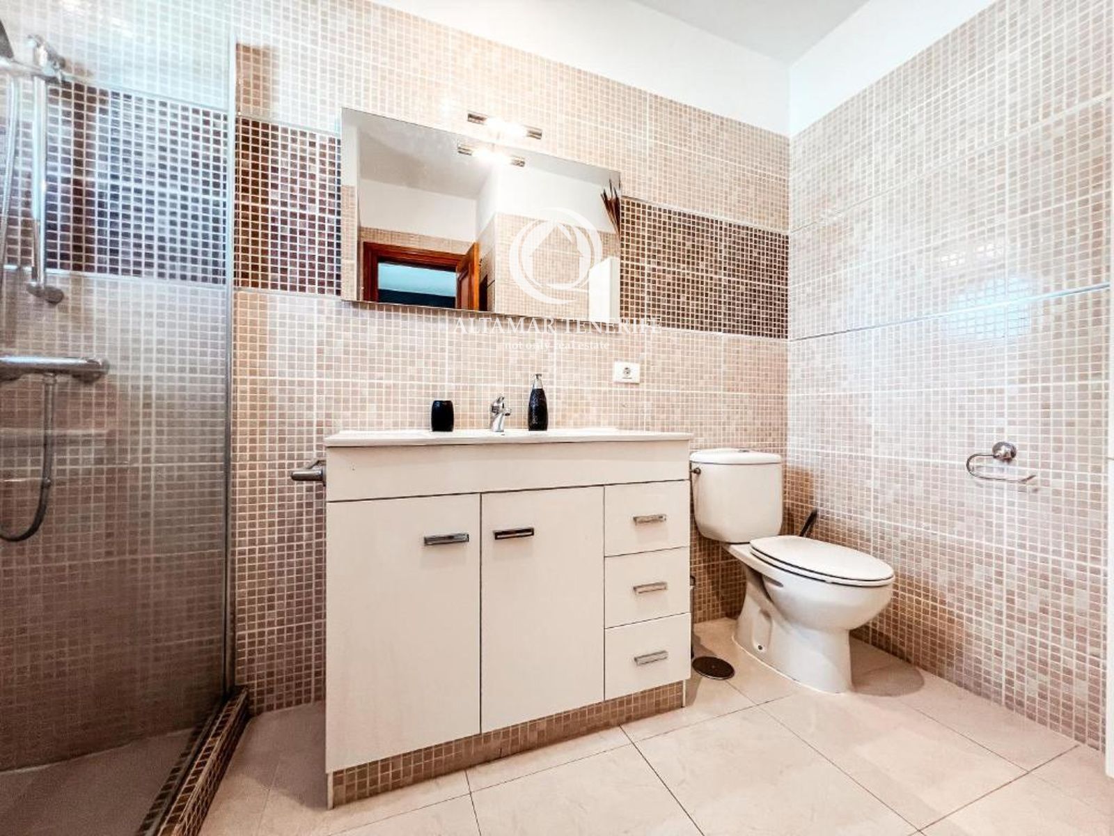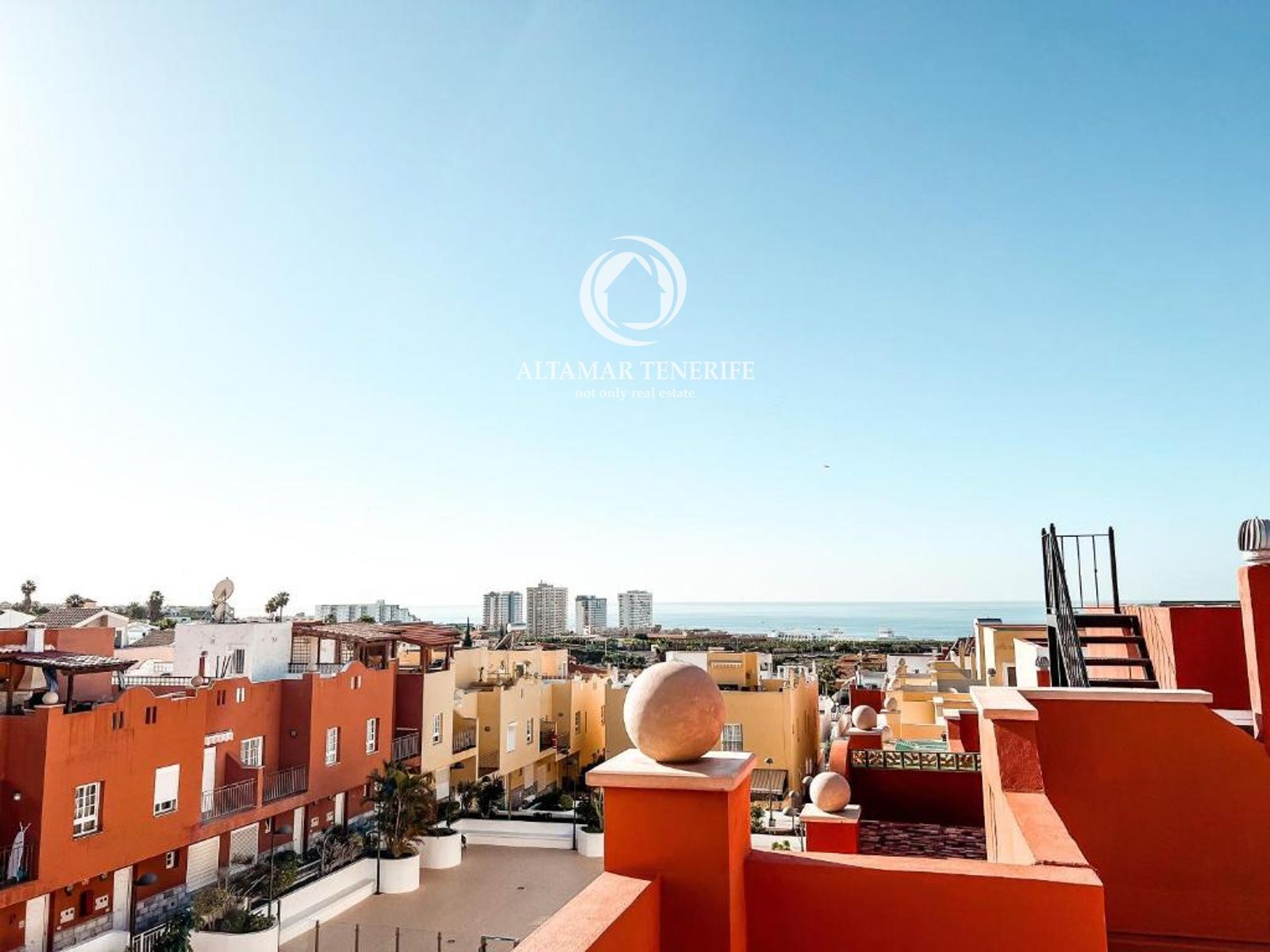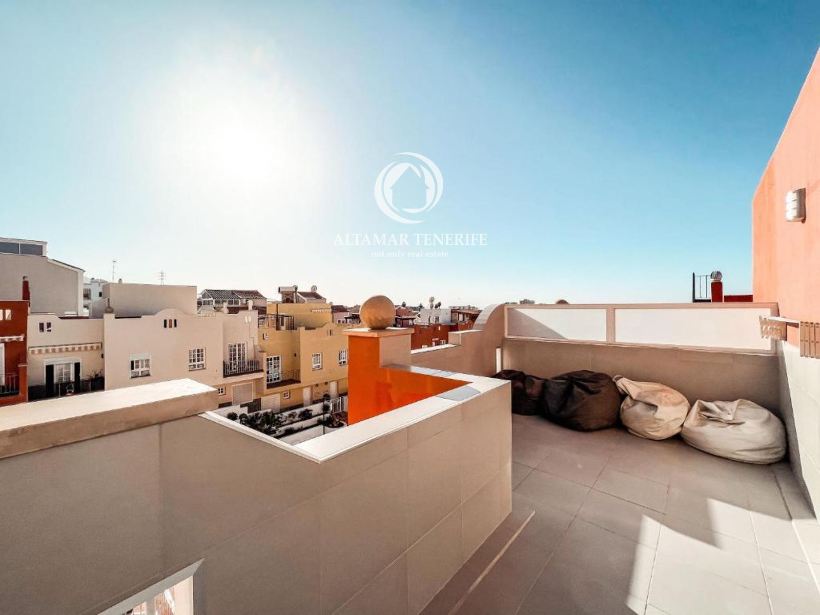 On the top floor, the property offers a large, fully renovated rooftop terrace equipped with a shower and relaxation area. This private space provides excellent views of the sea and the complex surroundings.