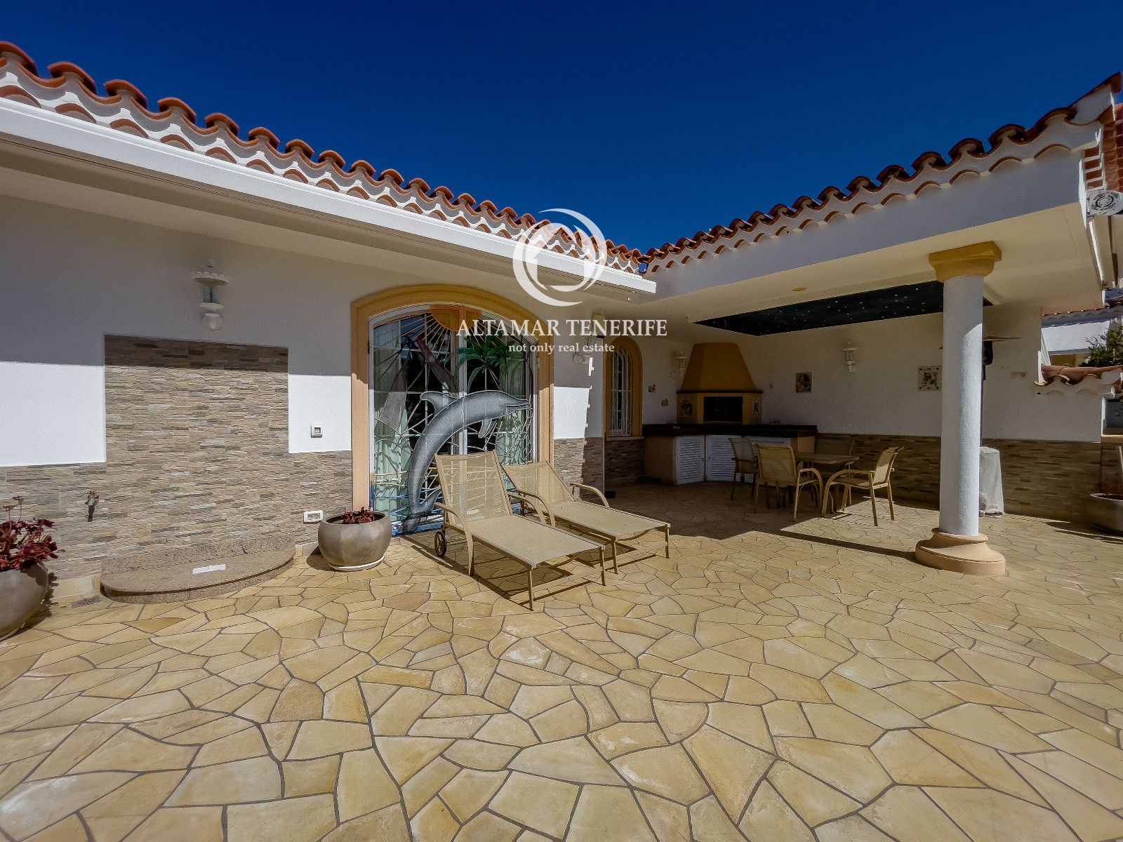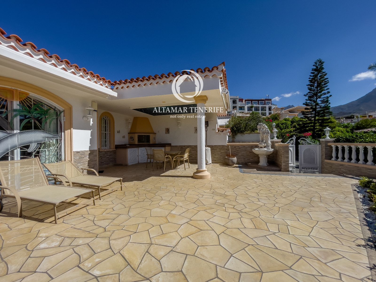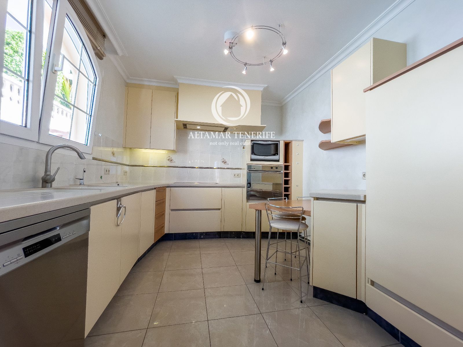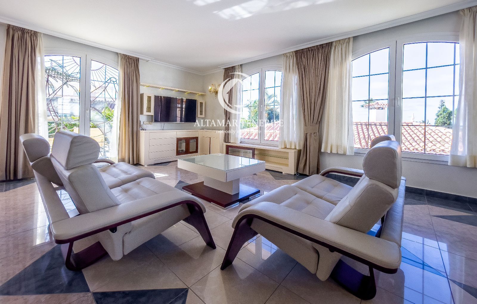 La propiedad combina lujo y confort en cada detalle. En la planta principal se encuentra un amplio salón amueblado con piezas Roche Bobois, una cocina independiente totalmente equipada, un aseo y una gran terraza con barbacoa, jardín y vistas parciales al océano y a la montaña.