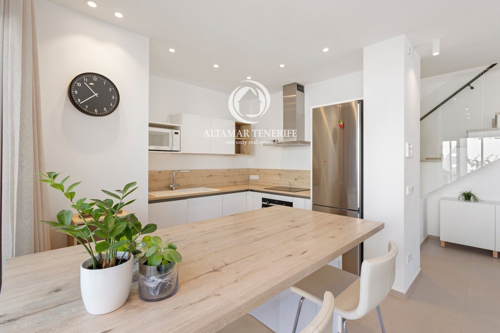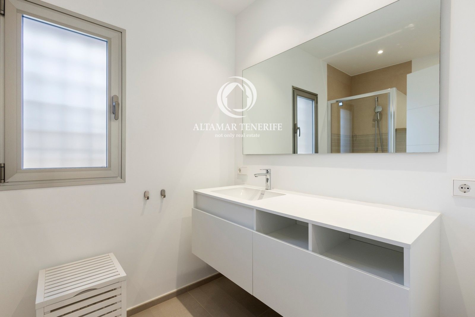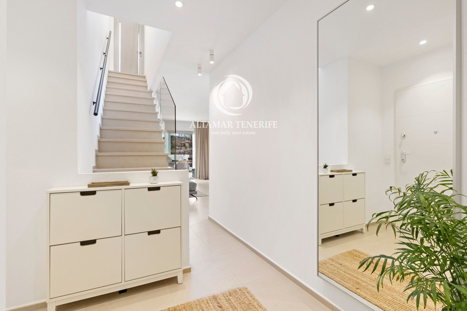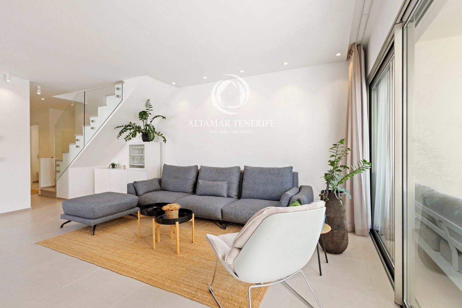 La vivienda cuenta con 3 dormitorios en suite y un aseo adicional para invitados, combinando comodidad, funcionalidad y estilo. En la planta baja, dos amplias terrazas proporcionan luminosidad y espacios al aire libre, mientras que una escalera interior conecta con el solárium privado, donde se encuentra un jacuzzi perfecto para relajarse y disfrutar del clima canario.