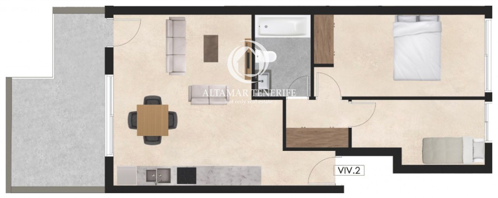 Este moderno apartamento de 2 dormitorios combina comodidad y eficiencia. La zona de día integra cocina lineal completamente equipada, comedor y salón en un espacio amplio y luminoso, con acceso directo a una terraza privada perfecta para relajarse o disfrutar del aire libre.