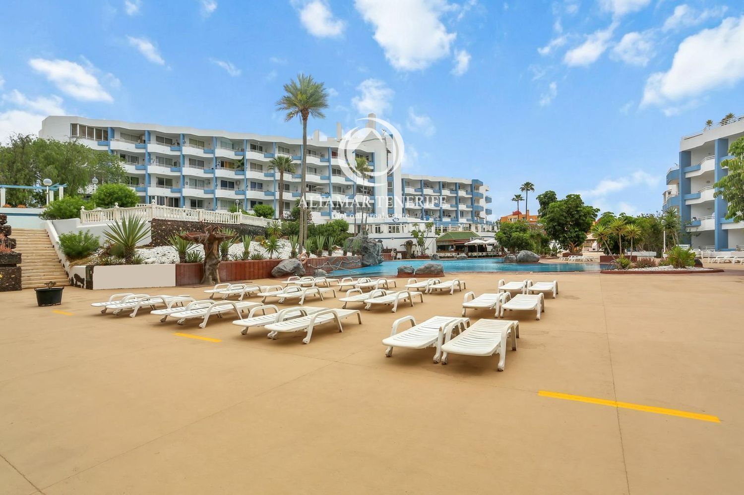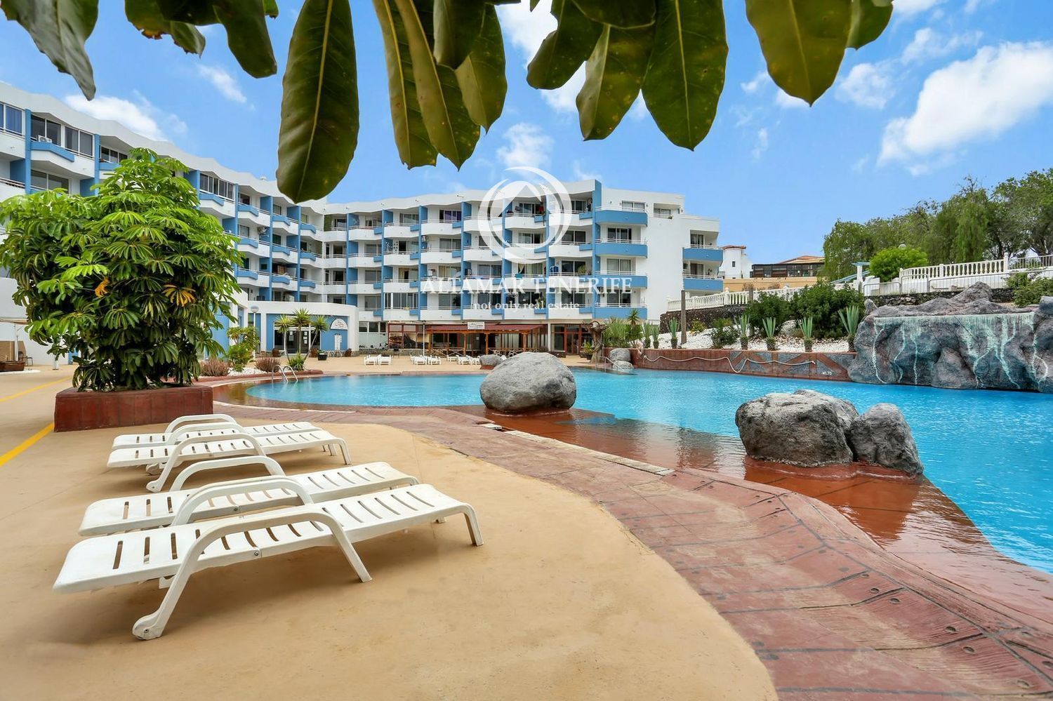 El complejo ofrece piscina comunitaria, piscina infantil, solárium con hamacas, zonas ajardinadas y servicios como supermercado y bares.