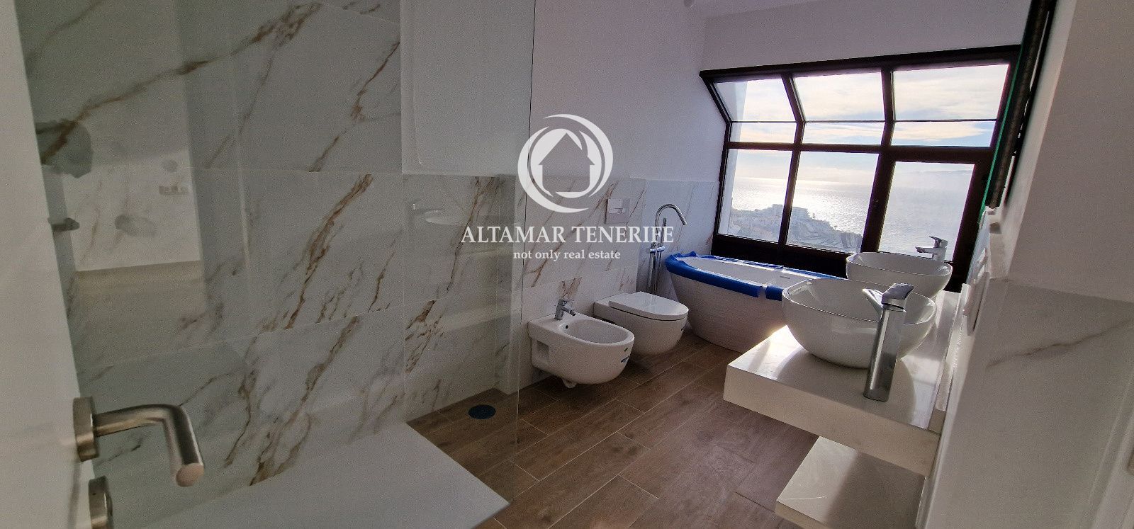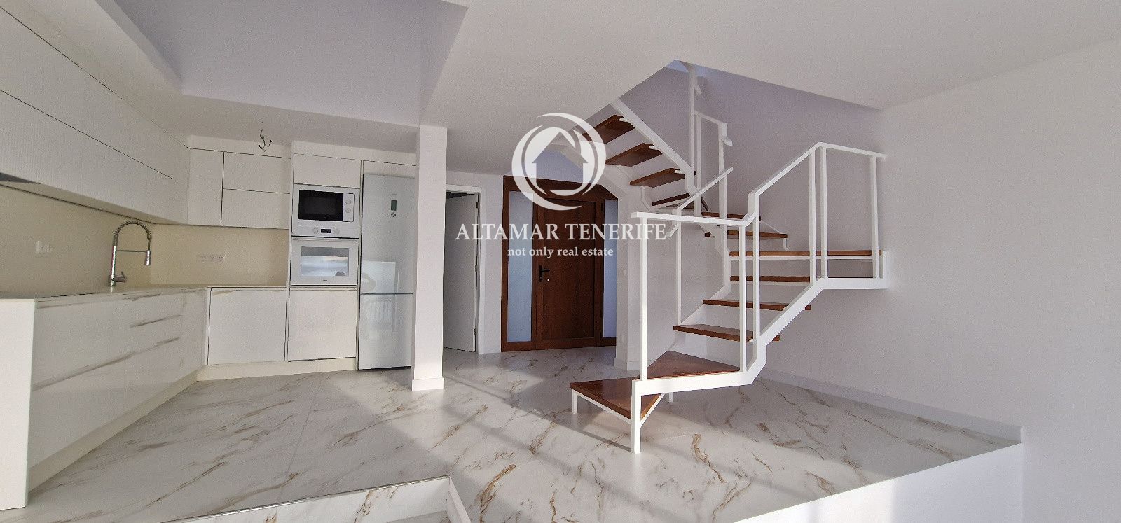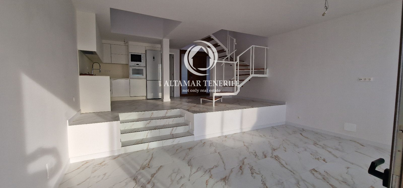 Este dúplex completamente renovado cuenta con cocina moderna equipada, salón-comedor luminoso y terraza de 49 m² con vistas al Atlántico y las islas cercanas. En la planta superior hay dos dormitorios dobles, uno con balcón privado, y un baño con ducha y bañera frente a un ventanal panorámico.