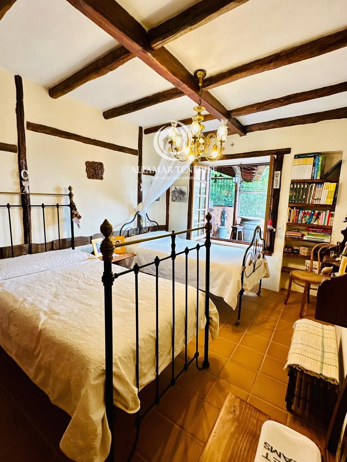 La vivienda principal conserva el carácter tradicional y dispone de tres dormitorios, dos baños, una acogedora biblioteca, amplio salón con gran chimenea, bodega, cocina con comedor, hall y zona de servicio/lavandería.