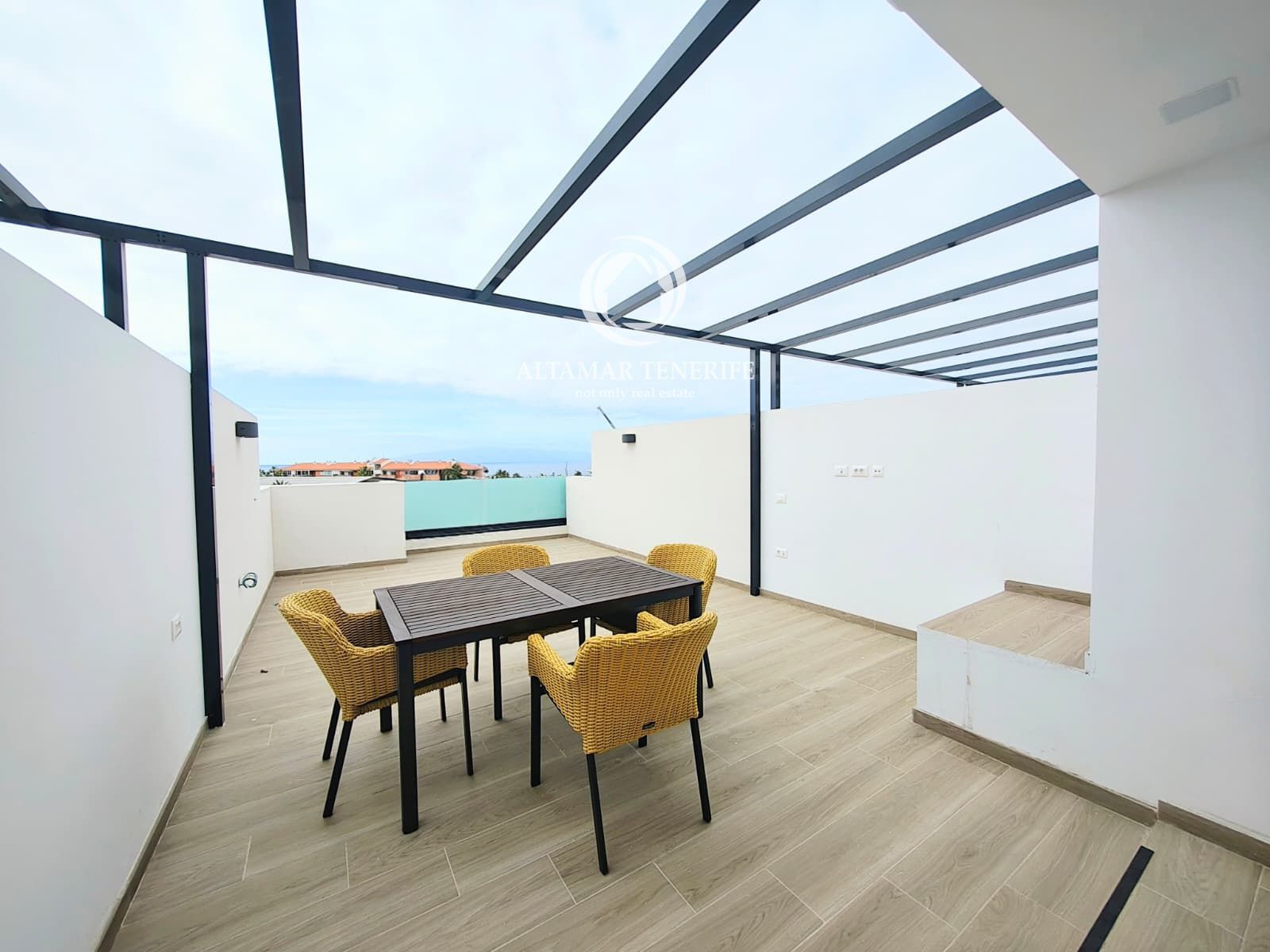 La propiedad ofrece varias zonas exteriores: terraza cubierta, balcón y solárium de aprox. 40 m², ideal para disfrutar del clima y las vistas. Incluye garaje cerrado de 27 m² con acceso directo a la vivienda.